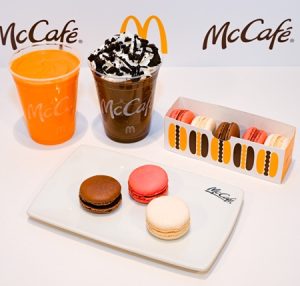 新店では、いままで販売していなかった、カフェラテ、フラッペ、マカロンなどのMcCafe商品も販売いたします。