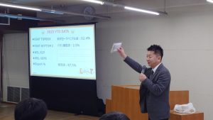 株式会社ノモト税理士先生はじめ、マクドナルド社の各担当者より全国の現状や、それに対するノモトの現状に関して、良い点や今後取り組むべきことを共有していただきました。※写真は1班の発表より