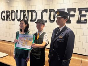 【当日の写真】 左より大学生ボランティア、三浦雄一店長、県警本部少年課 坂本晋伍課長補佐